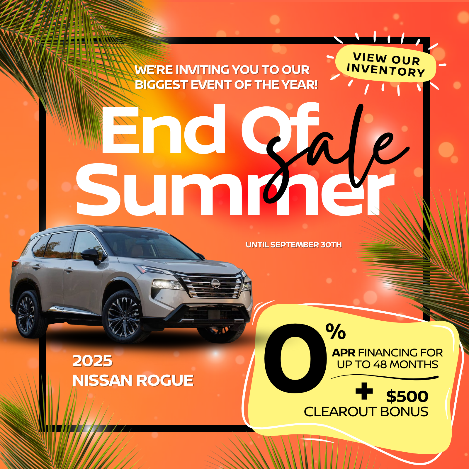 0% finance available on approved credit (OAC) for up to 48 months on 2025 Rogue models. $500 Clearout Bonus applied to eligible purchases. Offer valid until September 30, 2025. Conditions apply. See dealer for details.